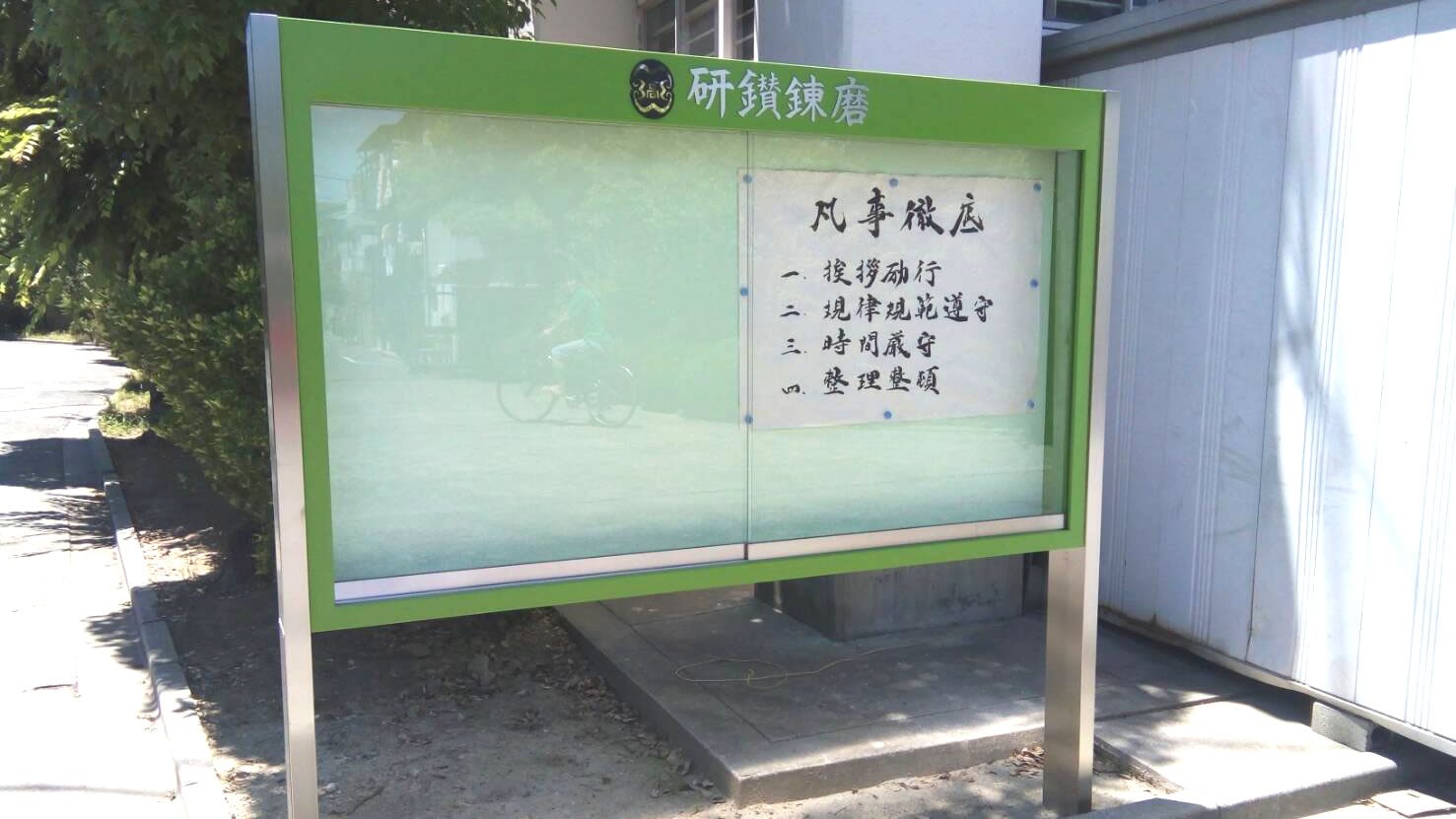 創立40周年記念事業「掲示板」寄贈 ▲新掲示板の設置完了までを追っています。 同窓会と卒業学年が協賛で新しい掲示板を学校に贈呈しました。 この掲示板は、卒業生に製作していただきました。 ・7期生 森口浩平さん(大同銘工株式会社代表) ・9期生 山上繁則さん(錦鉄工所代表) 短期間の製作日程依頼にもかかわらず、入学式に間に合わせていただきありがとうございました。
